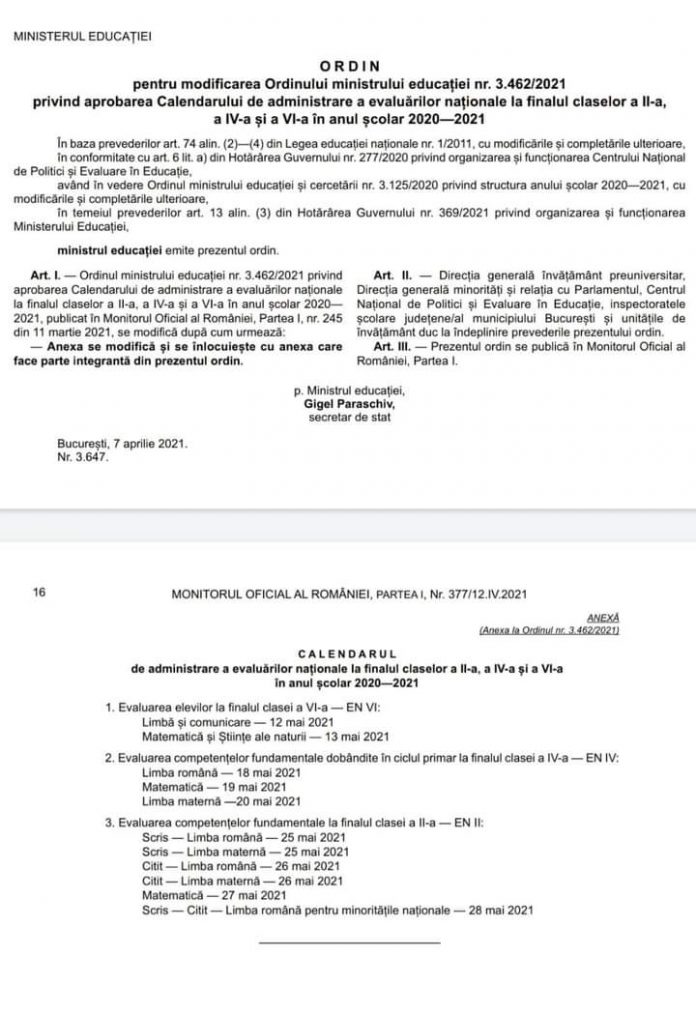Noul calendar de administrare a evaluărilor naționale la finalul claselor a II-a, a IV-a și a VI-a a fost publicat în Monitorul Oficial.