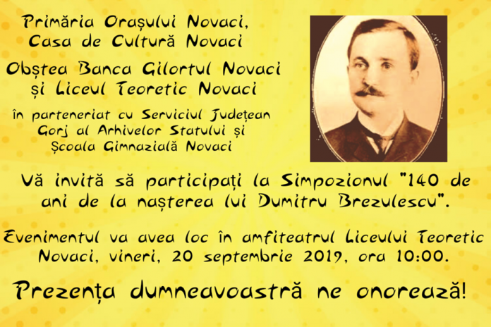 Primăria Orașului Novaci prin Casa de Cultură Novaci, Obștea Banca Gilortul Novaci și Liceul Teoretic Novaci în parteneriat cu Serviciul Județean Gorj al Arhivelor Statului organizează astăzi Simpozionul “140 de ani de la nașterea lui Dumitru Brezulescu”. Evenimentul va avea loc în amfiteatrul Liceului Teoretic Novaci avand ca invitați reprezentanti ai unor instituții locale si județene, profesori de istorie, reprezentanți ai presei, tineri și localnici interesați de trecutul, prezentul și viitorul orașului Novaci.
