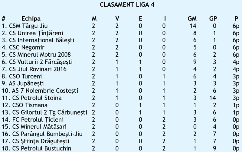 S-a consumat a doua etapă în principalul campionat din fotbalul județean. Liga 4 a programat, în weekend, jocurile rundei, iar spectatorii gorjeni au avut gol sau goluri pe toate arenele. CSM Târgu Jiu rămâne lider în campionat datorită golaverajului, deși s-a impus, la limită, pe stadionul din Mătăsari, după un penalti transformat în prelungiri. Alte patru echipe au punctaj maxim după finalul de săptămână. Vicecampioana Jiul Rovinari a reușit prima victorie din actualul sezon, în timp ce „satelitul” vulturilor din Fărcășești a făcut scorul etapei. Cinci formații au rămas fără punct după debutul Ligii a patra din Gorj.