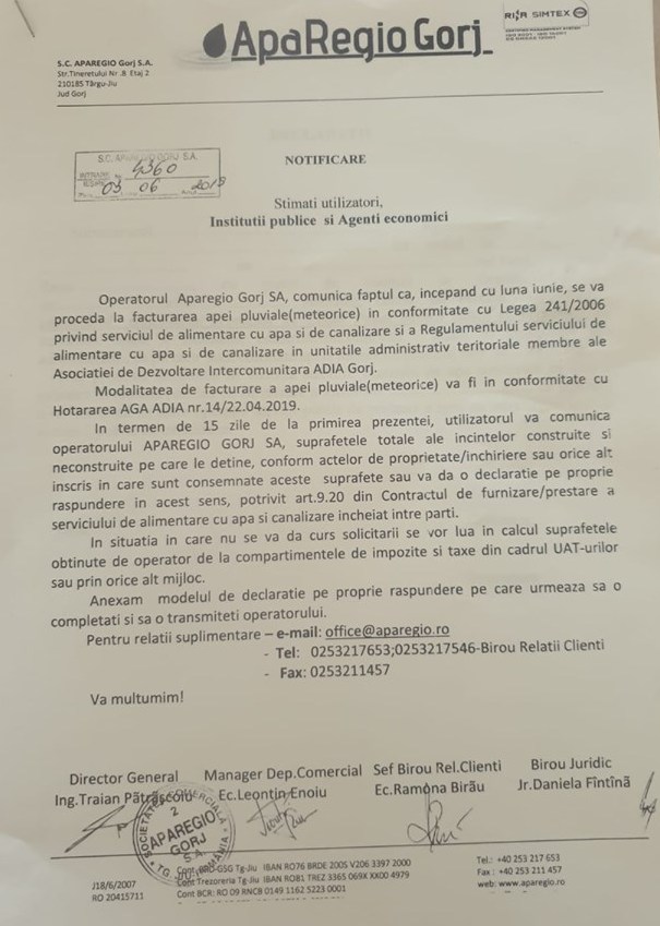 ,,Clientela PSD-ALDE, angajată pe bani grei la operatorul de apă și canal APAREGIO, costă din ce în ce mai mult, iar societatea a început să hărțuiască până și firmele din municipiu ca să stoarcă mai mulți bani! După ce a creat un adevărat haos în municipiul Târgu-Jiu cu o canalizare pe fonduri europene executată prost și care s-a dovedit ineficientă, inundând orașul la fiecare ploaie, Aparegio a cășunat pe populație cerând mai mulți bani, taxând apa de ploaie de pe dealuri și din păduri, iar acum vor urma și firmele care deja au fost notificate că, începând din luna iunie, urmează să plătească și ele taxa pe apa de ploaie. Nu contează că multe dintre aceste firme nu beneficiază de canalizare! Trebuie să plătească pentru că așa vor niște indivizi însetați de bani! Bineînțeles, totul se întâmplă cu acordul