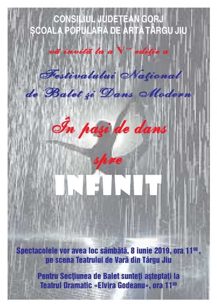 Dansul contemporan, dansul modern, baletul, fantezia coregrafică, street dance-ul s-au întâlnit în cadrul celei de-a V-a ediții a Festivalului Național de Balet si Dans Modern ”În pași de dans spre infinit”, organizat de Școala Populară de Artă și Consiliul Județean Gorj, la sediul școlii și pe scena Teatrului Dramatic ,,Elvira Godeanu” din Târgu-Jiu.
