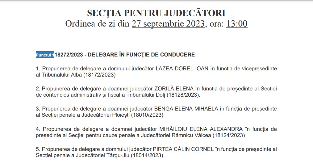 „Propunerea de delegare a domnului judecător Pirtea Călin Cornel în funcția de președinte al Secției penale a Judecătoriei Târgu Jiu”, se află pe ordinea de zi a ședinței de miercuri.