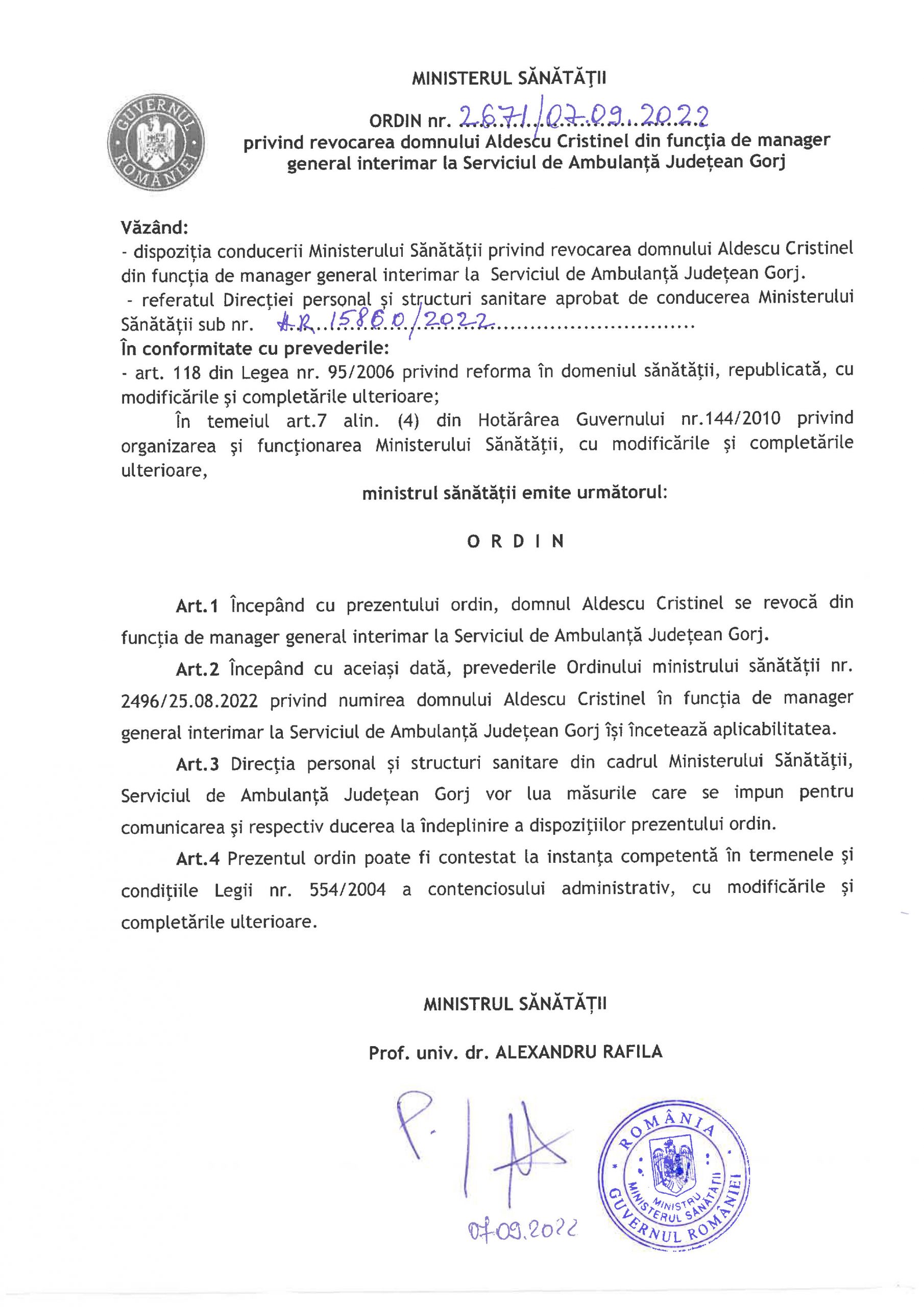 Drept urmare, pe 6 septembrie, Aldescu a fost eliberat din funcție iar pe 7 septembrie s-a dat ordinul de numire a lui Tiberiu Tătaru, fostul manager al Spitalului Județean de Urgență Târgu Jiu, pe funcția de manager SJA Gorj.