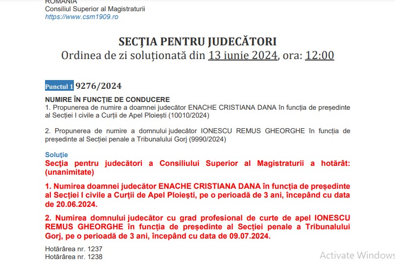 Astfel, în ședința din 13 iunie, Secția pentru judecători a CSM a decis „numirea domnului judecător cu grad profesional de curte de apel Ionescu Remus Gheorghe în funcția de președinte al Secției penale a Tribunalului Gorj”. Numirea este pe o perioadă de trei ani, începând cu data de 9 iulie 2024. Decizia a fost luată cu unanimitate de voturi.