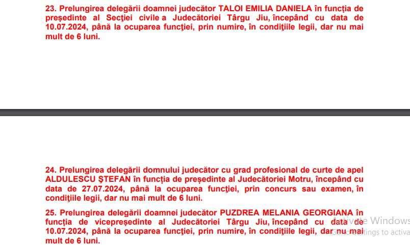 Totodată, CSM a hotărât „prelungirea delegării doamnei judecător Taloi Emilia Daniela în funcția de președinte al Secţiei civile a Judecătoriei Târgu Jiu, începând cu data de 10.07.2024, până la ocuparea funcţiei, prin numire, în condiţiile legii, dar nu mai mult de 6 luni”.