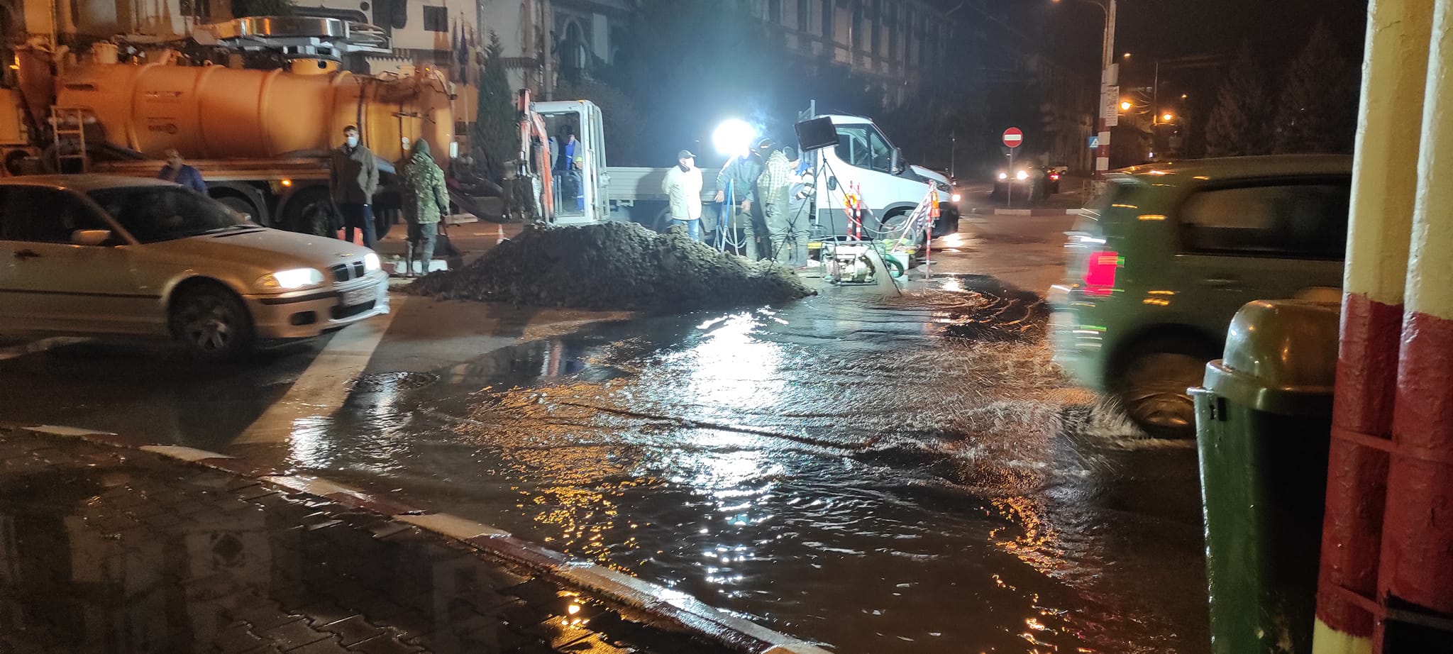 Dorel a lovit din nou! În giratoriul de la Tudor Vladimirescu, cea mai importantă stradă a fost inundată, în această seară, și un maldăr de pământ tronează în mijloc.