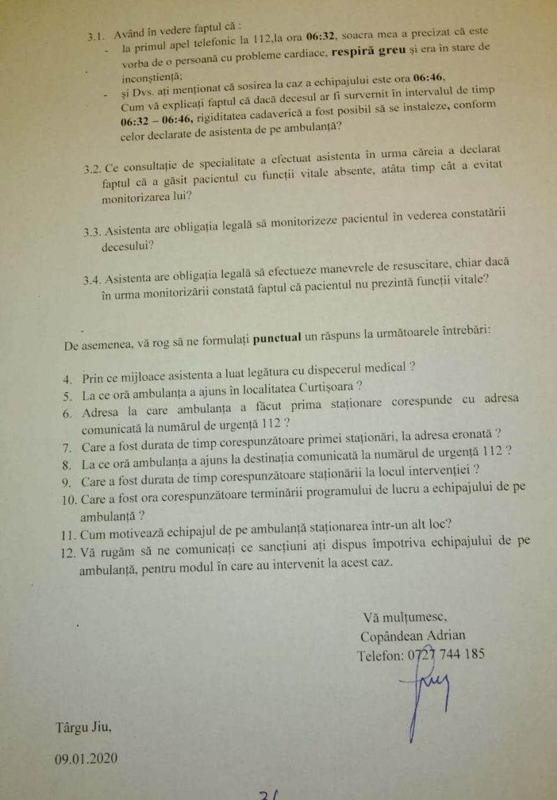 Acesta nu a efectuat niciun fel de consultație privind analiza integrală a corpului, decide că nu e moarte suspectă și nu este necesar ca pacientul să fie transportat la Medicina Legală. În situația în care, procedura ar fi fost alta, adică decedatul ar fi ajuns la SML, s-ar fi constatat cauza și ora decesului, cred aparținătorii decedatului, care pun vina pe asistentă pentru asta. În mod normal, în acest caz și medicul de familie trebuia să se prezinte la caz, lucru pe care nu l-a făcut. Familia explică că, urmare a acestor numeroase semne de întrebare, decide să ceară explicații SJA, și face o petiție în acest sens.