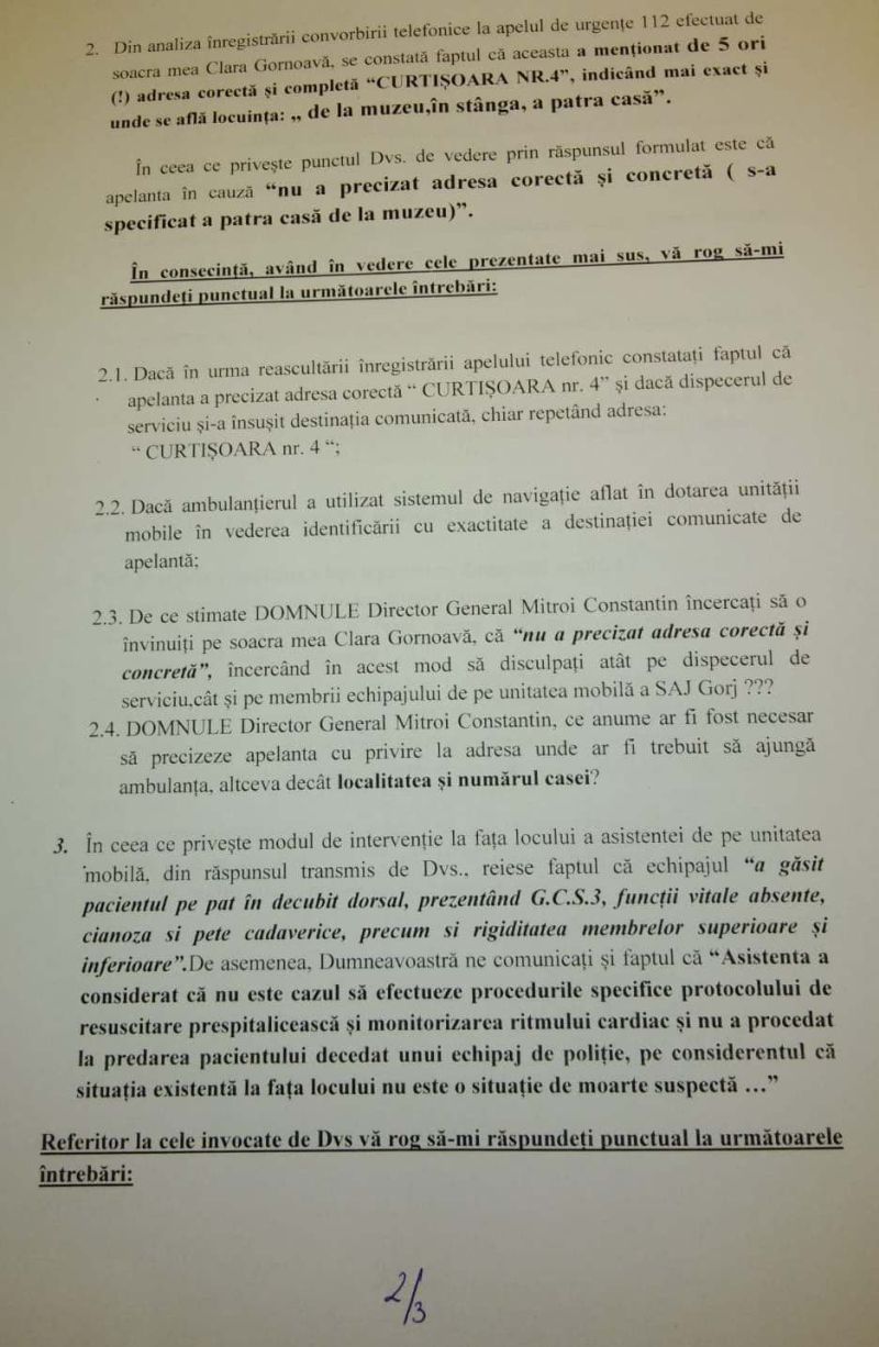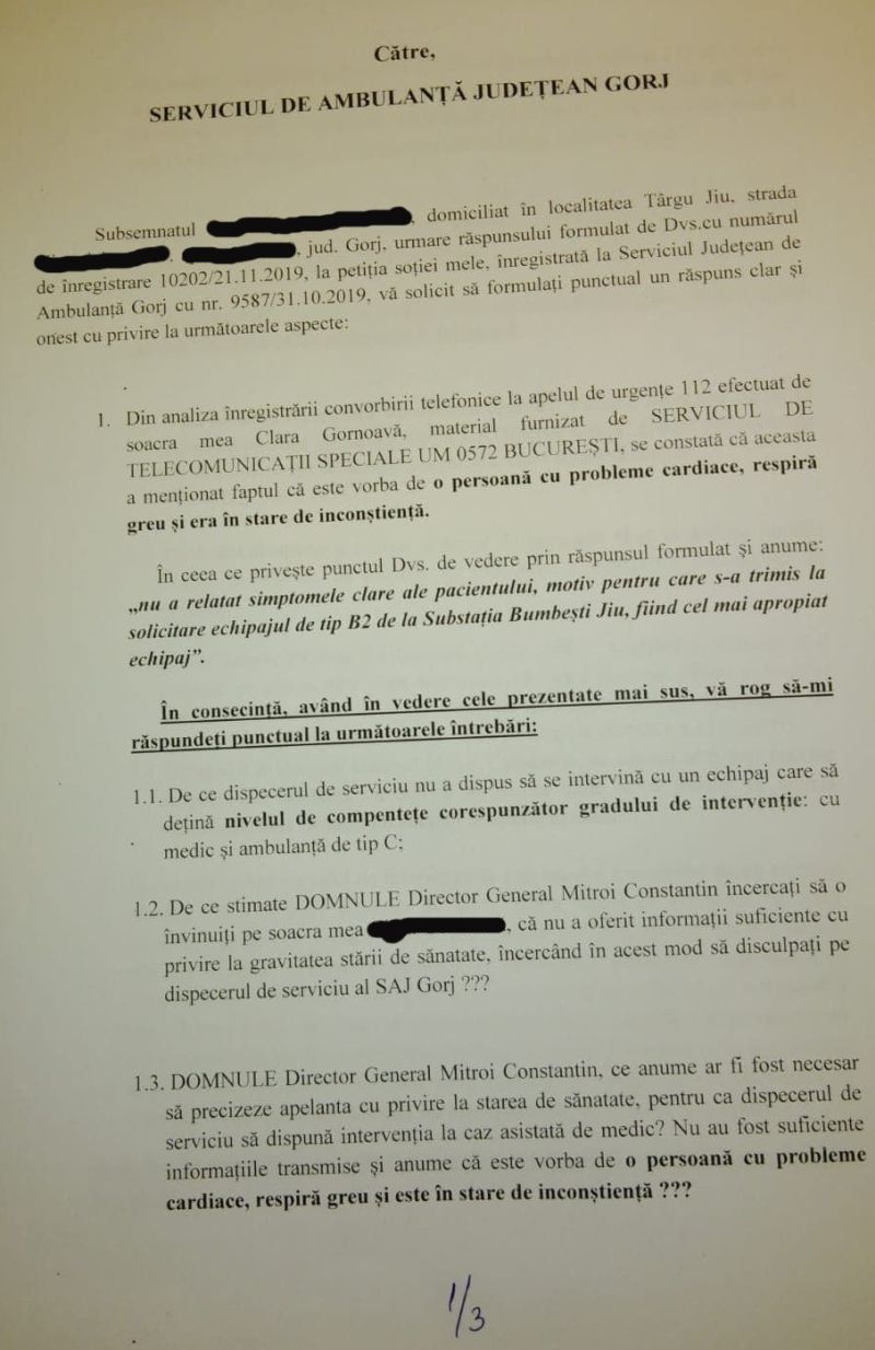 Situația de la Curtișoara a fost reclamată SJA Gorj pe 31 octombrie, la două săptămâni de la decesul lui Gornoavă Constantin, survenit, potrivit familiei din cauze necunoscute care s-ar fi datorat și ,,intervenției superficiale a echipajului de pe ambulanță”. Familia cere sancționarea echipajului de pe ambulanța de tip B care ajunge fără medic la caz, și, mai mult, greșește adresa la care trebuia să ajungă. Aparținătorii decedatului susțin că dispecerul nu coordonează corect situația, trimițând la pacient o ambulanță fără medic, pe motiv că acesta nu ar fi fost de gravitatea care ar fi impus o ambulanță de tip C. Practic, se trimite la caz o autospecială cu asistent de la substația de la Bumbești-Jiu, pe motiv că aceasta ajunge mai repede la caz.