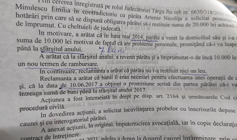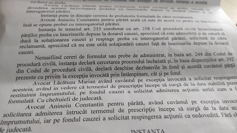 Cele două au încheiat un acord de mână prin care pârâta se obligă să restituie banii împrumutați în patru luni de zile, iar dacă depășea termenul ar fi urmat să restituie 10% din sumă, pe luna întârziată.