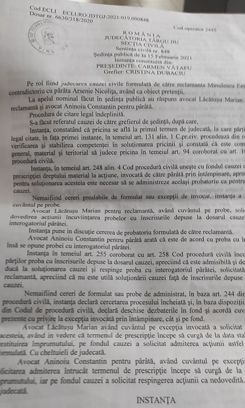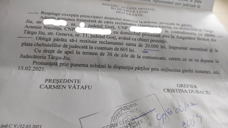 Evident că nu face nici asta, iar Emilia Minulescu se îndreaptă în instanță împotriva respectivei pentru recuperarea banilor. Pe 15 februarie 2021, pensionara câștigă procesul la Judecătoria Târgu-Jiu, instanță care o obligă pe salariata care este dată afară, între timp, de la Allianz Țiriac deoarece face același lucru și altor clienți, să plătească debitul.