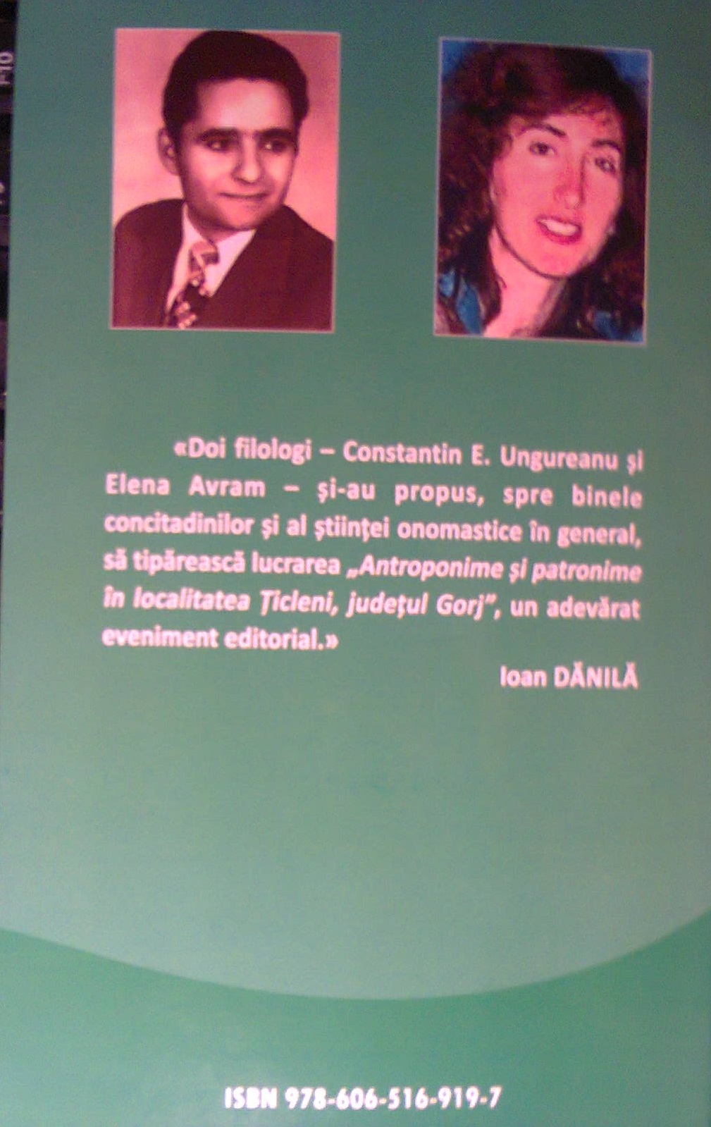 Această carte-document, atât de sugestiv intitulată: «Antroponime şi patronime în localitatea Ţicleni, judeţul Gorj», apărută la Editura «MĂIASTRA», Târgu-Jiu, 2017, pot spune că am păstrat-o multă vreme şi cu o sfinţenie nemărturisită în memoria indelebilă a curgerii timpului şi aş îndrăzni să afirm cu satisfacţia căutătorului de comori tainice, că am parcurs-o de mai multe ori, mai întâi din curiozitate, iar, după aceea, pentru a decripta înţelesurile pline de substanţă ale demersurilor celor doi coautori, prestigiosul profesor de limba şi literatura română, domnul Constantin E. Ungureanu şi respectabila şi cea mereu plina de viaţă şi deplina doamnă Elena Calotă-Avram, pe care o gratulez cu deosebit respect şi cu aleasă preţuire cu apelativul de…domnişoara Ileana!