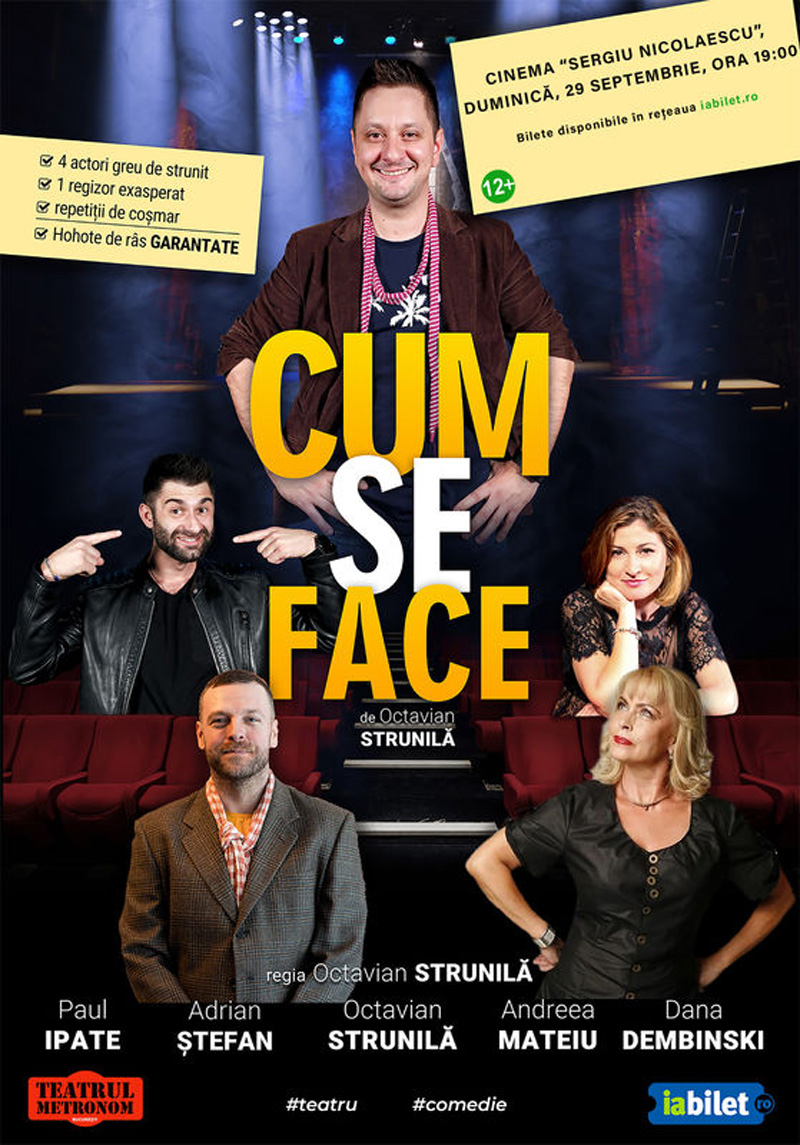 Spectacolul este oferit de Teatrul Metronom și cei care vor alege să îl vizioneze trebuie să se aștepte la hohote de râs! ,,Este o comedie pentru oameni inteligenți! Un spectacol scris și regizat de Octavian Strunilă, cum se spune în popor: O comedie de-a râsu’-plânsu’! Inspirat din viața reală, spectacolul ne prezintă lumea plină de farmec a culiselor unui spectacol de teatru. Devenim martori la procesul de creație prin care trec artiștii, cu o sumedenie de momente comice dar și triste în același timp, de la prima zi de repetiție până la premiera unui spectacol compromis din născare. Spectacolul ,,Cum se face” are în distribuție pe: Dana Dembinski, Andreea Mateiu, Paul Ipate, Adrian Ștefan, Octavian Strunilă, și se dorește a fi o comedie pe gustul spectatorului de astăzi… O comedie inteligentă! Regie și Scenariu: Octavian Strunilă. Vârsta minimă de acces la spectacol este de 12 ani!”, au transmis organizatorii. Biletele la acest spectacol au fost deja puse în vânzare prin intermediul platformei iabilet.ro. Acestea au prețuri cuprinse între 85 de lei și 110 lei în funcție de configurarea locurilor din sală.