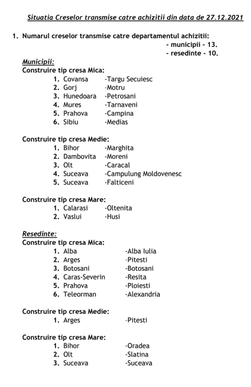 În urma cu două luni, primarul din Motru a depus solicitare pentru realizarea unei creșe tip, de la zero, pentru municipiu. Cu toate că, la timpul respectiv, problema părea imposibil de realizat, urmare a timpului scurt pentru depunerea documentelor necesare (teren, dovada proprietății, studiu geotehnic, hotărâre de CL…etc), s-a reușit depunerea tuturor documentelor în timp record, lucru care a făcut că la această dată, Ministerul Dezvoltării să anunțe cele 23 de grădinițe scoase deja la licitație.