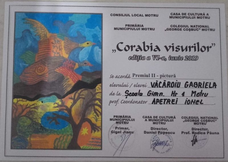 Văcăroiu Gabriela, elevă în clasa a VIII-a B, la Școala Gimnazială nr.1 din Motru, a urcat pe podium la un concurs de desen organizat în localitate. Eleva nu este la primul premiu obținut urmare a talentului său la desen, fata primind și alte distincții pentru lucrările realizate.