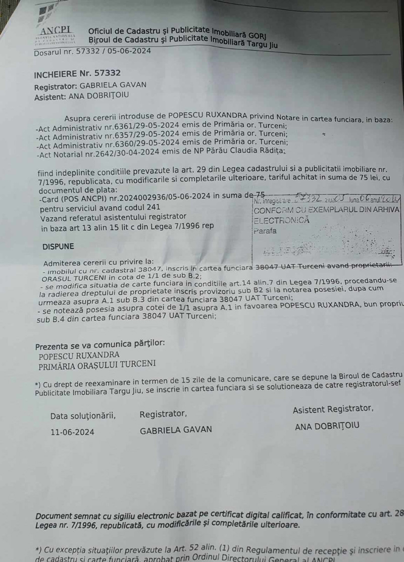 Acest caz a fost prezentat ziariștilor de la ,,Gorjeanul” de Maria Ciolacu, una dintre fiicele Ruxandrei Popescu, o bătrână din Turceni, care de ani de zile este pusă pe drumuri de autoritățile locale, nereușind să facă dovadă că este proprietară pe terenurile deținute și moștenite de la părinți, socri și cumnați. În cartea funciară, inclusiv terenul de sub casa Ruxandrei Popescu era trecut pe numele Primăriei Turceni. De-a lungul anilor, femeia a plătit impozite pentru acesta, neștiind că nu este proprietară cu acte în regulă. Potrivit fiicei femeii, astăzi, la Primăria Turceni ar fi programată o ședință pentru a se dezbate cazul acestor împroprietăriri ori treceri din domeniul public în cel privat în baza actelor deținute de oameni, fiecare dintre cei care se consideră nedreptățiți urmând a fi așteptați cu documentele justificative.