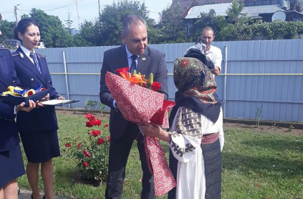”Aici, lângă mine, sunt toate structurile Ministerului Afacerilor Interne, care vor să vă facă o surpriză, pentru că 100 de ani, mai ales în 2018, când sărbătorim Centenarul Marii Uniri, nu face oricine”, i-a transmis prefectul Ciprian Florescu femeii din Ursați, oferindu-i flori, drapelul României, un tort și scrisoarea din partea ministrului de Interne.