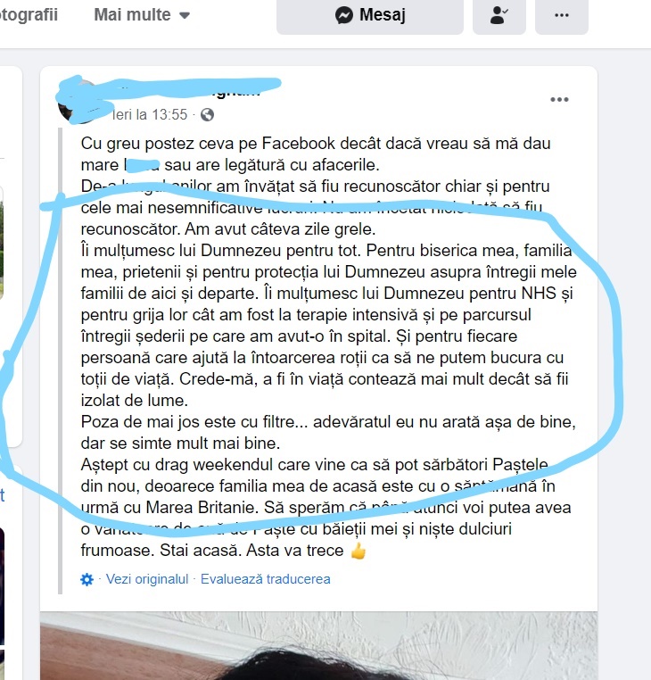 ,,Îi mulțumesc lui Dumnezeu pentru NHS(spital din Marea Britanie) și pentru grija lor cât am fost la terapie intensivă și pe parcursul întregii șederii pe care am avut-o în spital. Și pentru fiecare persoană care ajută la întoarcerea roții ca să ne putem bucura cu toții de viață. Crede-mă, a fi în viață contează mai mult decât să fii izolat de lume. Poza de mai jos este cu filtre… adevărata eu nu arată așa de bine, dar mă simt mult mai bine. (…) Stai acasă. Asta va trece”.