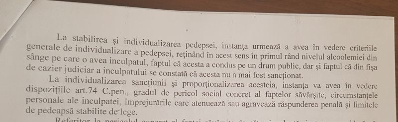 ,,La stabilirea și individualizarea pedepsei, instanța urmează a avea în vedere criteriile generale de individualizare ale pedepsei, reținând în acest sens, în primul rând, nivelul alcoolemiei din sânge pe care o avea inculpatul, faptul că acesta a condus pe un drum public..”-fragment din sentința Judecătoriei Novaci în dosarul penal nr.2043/267/2016.