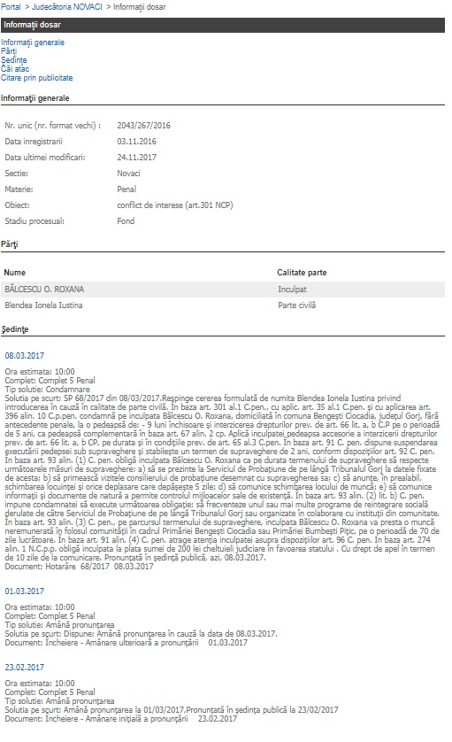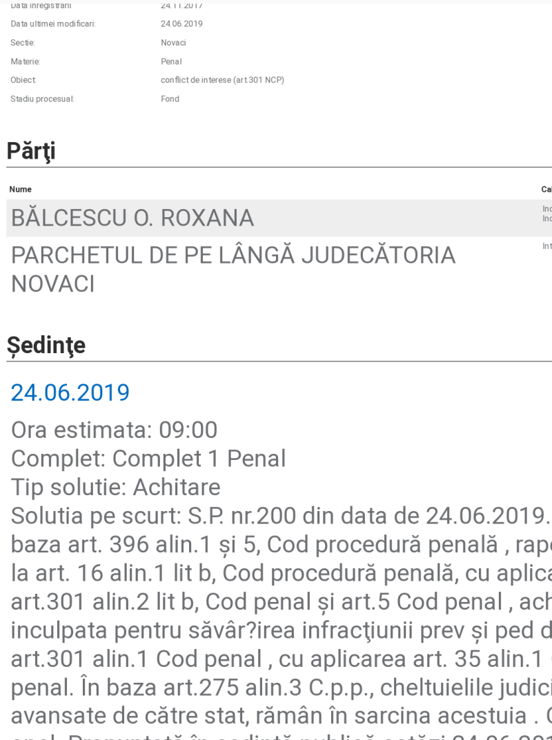 Caz fără precedent în justiția gorjeană, după ce o judecătoare de la Judecătoria Novaci, transferată între timp din instituție, a dat o sentință pentru alcoolemie, într-un dosar penal de conflict de interese. Mai mult, magistratul a condamnat cadrul didactic acuzat, la nouă luni de închisoare cu suspendare, pentru o faptă pe care acesta nu a comis-o. Sentința din 2017 a Judecătoriei Novaci a fost anulată de Curtea de Apel Craiova, care a trimis dosarul spre rejudecare, considerând că inculpatei i s-au încălcat toate drepturile procesurale. Luni, o altă instanță de la Novaci a achitat-o pe Roxana Bălcescu pentru conflict de interese, asta după patru ani și jumătate de procese în care aceasta s-a apărat de acuzele nefondate la adresa sa, perioadă în care a renunțat la funcția de conducere, iar mama sa la postul obținut prin concurs.