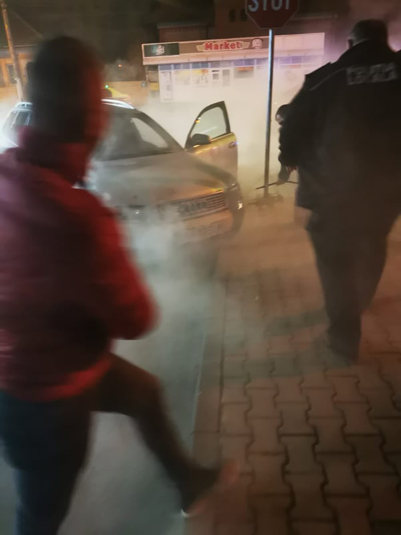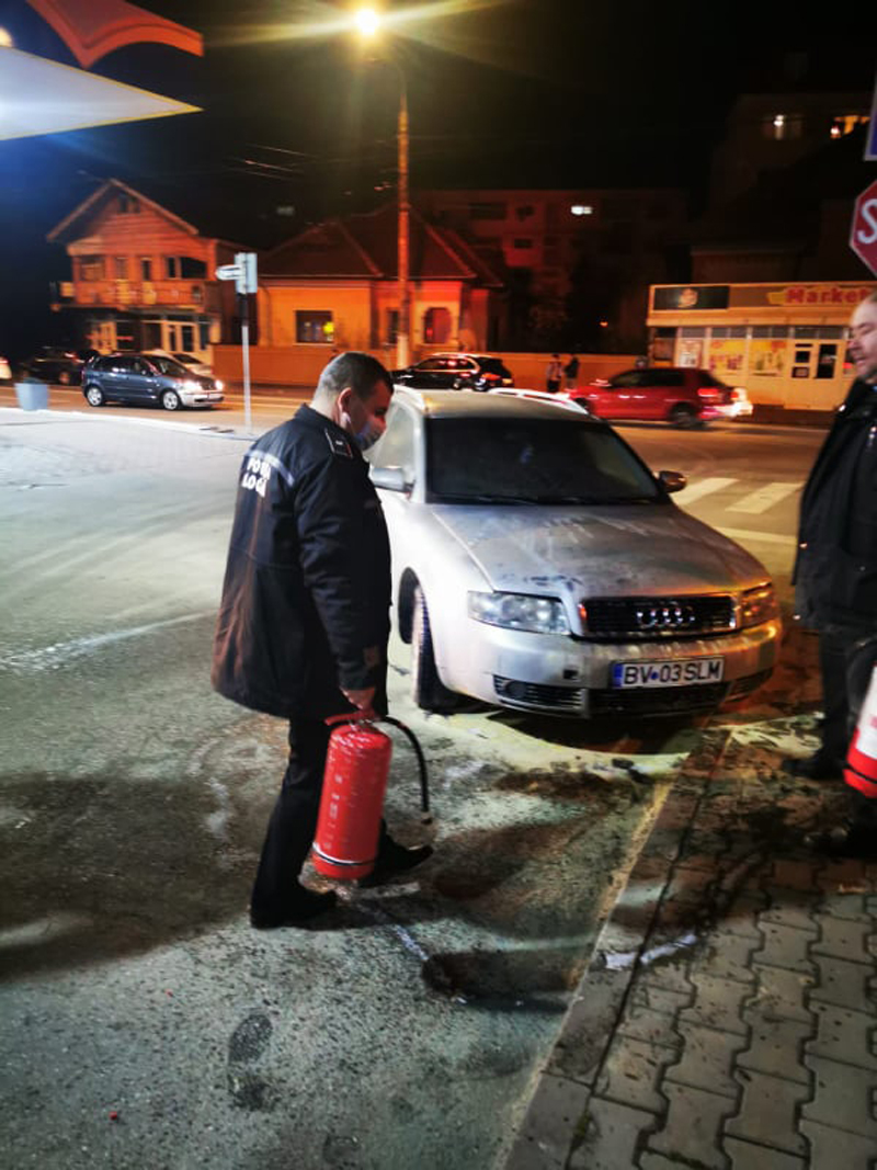 Mașina a fost stinsă de pompieri și de polițiștii locali, ajunși rapid la locul incidentului.