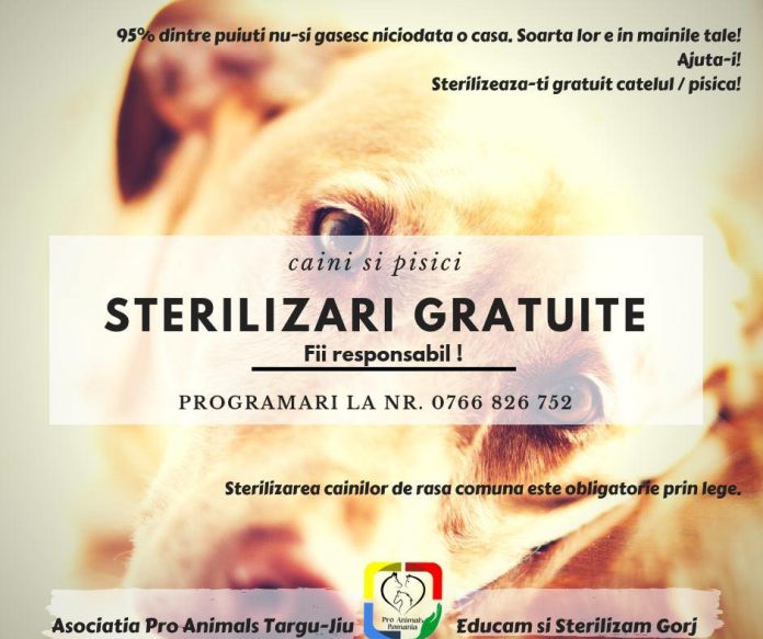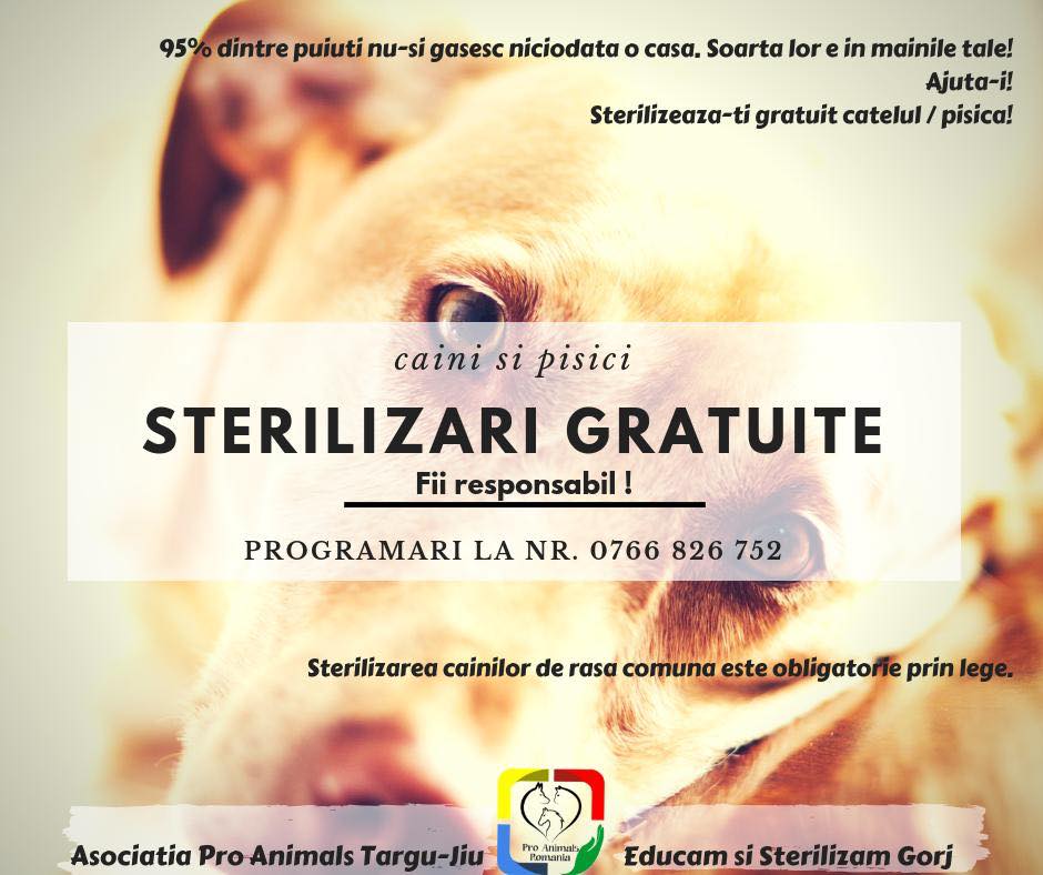 „Am dat startul programului de sterilizări gratuite pe anul 2019 în judeţul Gorj! Dacă aveţi căţei/pisici acasă, în jurul blocului sau în anumite zone aduceţi-i la sterilizat, nu îi lăsaţi să se mai înmulţească! Animăluţele trebuie ţinute într-un loc curat, la căldură, minimum cinci – șapte zile, postoperator! Se pot steriliza atât femele, cât și masculi, indiferent de specie (canină/felină), de rasă comună! Anunțați-vă vecinii, prietenii sau rudele de acest program și contactați-ne printr-un mesaj pentru programare la numărul de telefon afișat (0766.826.752), de luni până vineri, între orele 9.00 – 17.00, iar noi vom reveni cu un telefon pentru confirmare. Noi vă ajutăm cu sterilizarea gratuită, vă împrumutăm cuşti pentru transport şi putem găzdui gratuit câteva zile – prin bunăvoinţa cabinetului colaborator – animăluţele fără stăpân după sterilizare (dumneavoastră puteţi ajuta cu conserve şi pad-uri), dacă dumneavoastră nu aveţi unde, dar, din păcate, nu putem, cel puţin deocamdată, asigura prinderea şi transportul. Împreună putem reduce numărul animalelor fără stăpân și să stopăm abandonul, dar și cruzimile faţă de acestea!“, se arată într-un comunicat emis de reprezentanții Asociaţiei Pro Animals din Târgu-Jiu.