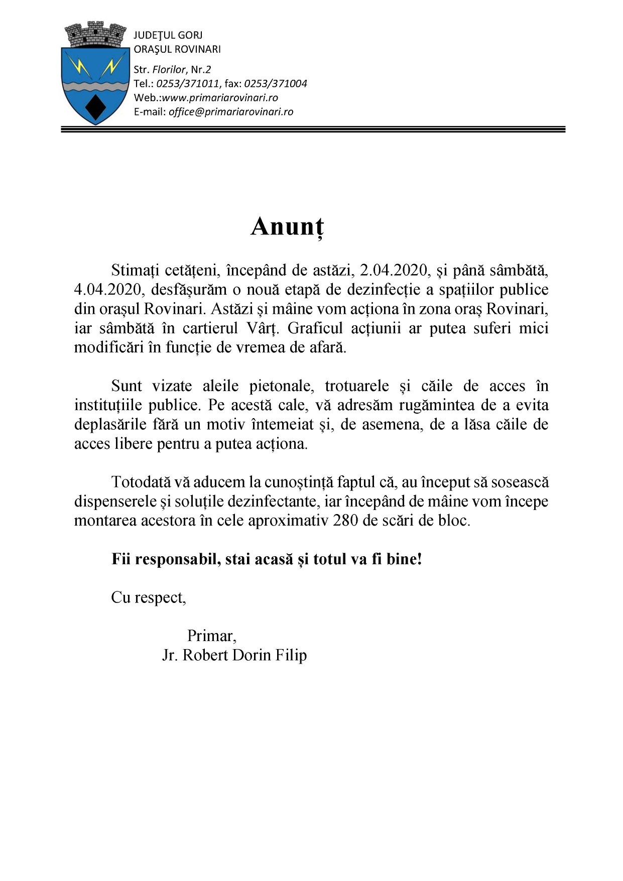 Primăria Rovinari anunță o nouă etapă de dezinfecție a spațiilor publice din oraș. Sunt vizate aleile pietonale, trotuarele și căile de acces în instituțiile publice. Acțiunea se încheie sâmbătă, în cartierul Vârț.
