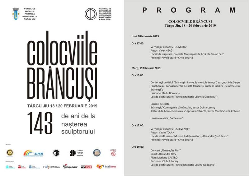 În zilele de 18 și 19 februarie 2019, Centrul de Cercetare, Documentare și Promovare “Constantin Brâncuși”, Consiliul Local şi Primăria Municipiului Târgu-Jiu organizează “Colocviile Brâncuşi”, manifestare dedicată Zilei Naționale Brâncuși, la 143 de ani de la nașterea sculptorului. Astfel, luni, 18 februarie, de la ora 17.00, la Galeriile Municipale de Artă, va fi vernisată expoziția “Umbra”, a sculptorului Valer Neag. Marți, 19 februarie, sunt programate trei evenimente: conferința științifică “Brâncuși – La vie, la mort, le temps”, cu începere de la ora 15.00, susținută de către cunoscutul critic de artă francez Serge Fauchereau, autor al lucrării “Pe urmele lui Brâncuși”, apoi vernisajul expoziției “Secvențe” a artistului plastic clujean Vasile Tolan (ora 17.00), iar seara se va încheia cu un concert susținut de către solista Alexandra Fits, acompaniată la pian de Mariano Castro, care va debuta la ora 19.00. Parteneri ai evenimentului sunt: Muzeul Național al Literaturii Române, Filiala Târgu-Jiu a Uniunii Artiştilor Plastici, Muzeul Județean Gorj “Alexandru Ștefulescu”, Teatrul Dramatic „Elvira Godeanu”, Clubul Rotary și Asociația pentru Democrație, Educație, Respect – ADER.