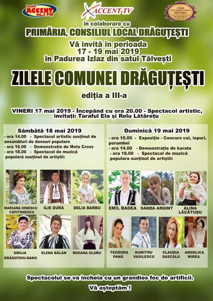 Artiști importanți de pe scena folclorului românesc se vor afla weekendul viitor la Drăguțești, acolo unde autoritățile locale vor organiza o nouă ediție a evenimentului Zilele Comunei Drăguțești.