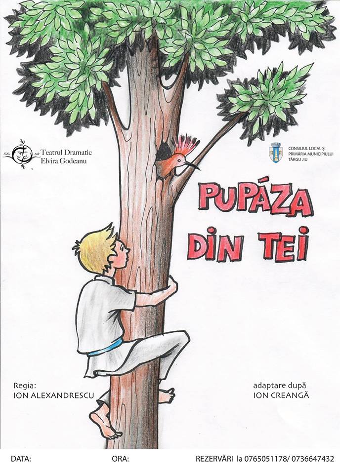 În atenţia copiilor, bunicilor, părinţilor târgujieni şi nu numai! Teatrul Dramatic “Elvira Godeanu” Târgu-Jiu vă invită duminică, 17 februarie, de la ora 12.00, la premiera spectacolului “Pupăza din tei”, adaptare după Ion Creangă, în regia lui Ion Alexandrescu. Preţul unui bilet pentru copii este de 10 lei, iar adulţii vor plăti 20 de lei pentru intrarea la acest spectacol. Vizionarea piesei oferă acces pe baza rezervării şi pentru posesorii abonamentelor ”Ligia Tilici”. Biletele se găsesc la agenția teatrului.