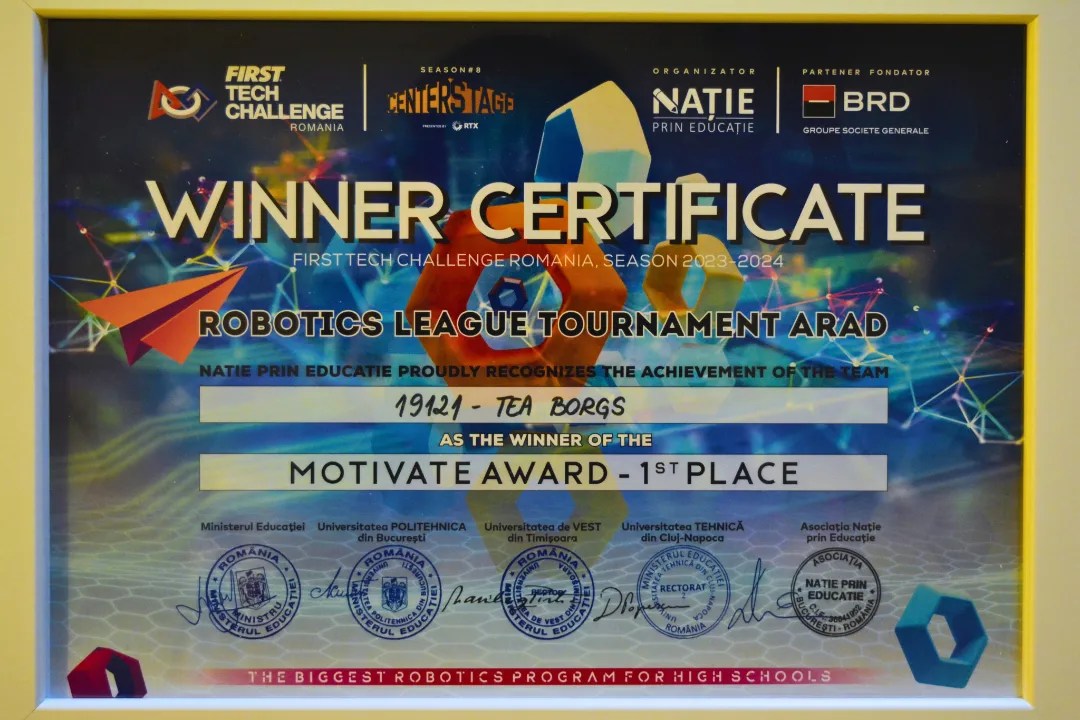 ”În perioada 23-25 februarie am participat etapa regională a competiției de robotică First Tech Challenger România, desfășurată în sala Polivalentă din Arad. După meciurile de calificare, ne-am clasat pe locul 5, loc care a permis accederea în semifinalele competiției ca și căpitani de alianță. În alianță am ales să jucăm cu echipele Soft Hoarders, ca 1st Pick și pe RaSky Robotics, ca 2nd Pick, cărora le mulțumim că au acceptat și ca au jucat aceste meciuri frumoase alături de noi. După încheierea competiției, am fost onorați să primim premiul MOTIVATE Award 1st Place, ca o recunoaștere a efortului nostru colectiv, a etuziasmului, pasiunii acordate fenomenului First. Acest premiu ne-a asigurat calificarea la etapa națională a competiției. Dorim să felicităm toate echipele participante pentru implicarea și atmosfera creată! Felicităm echipa Nație Prin Educație pentru organizarea excelentă a evenimentului și le mulțumim pentru eforturile lor de a promova interesul tinerilor pentru robotică! În final, dorim să adresăm sincere mulțumiri sponsorilor și partenerilor noștri, fără de care această experiență nu ar fi fost posibilă, dar și echipei proiectului Erasmus+ ”Robotics – as a tool to prevent bullying” pentru implicarea și ajutorul financiar acordat, și nu în ultimul rând Colegiul Național „Tudor Vladimirescu” Târgu Jiu și tuturor celor care s-au alăturat comunității noastre”, a transmis echipa de robotică Tea-Borgs.