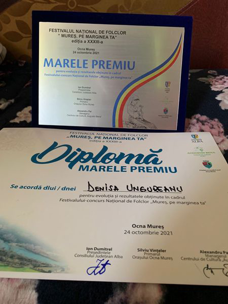 „Denisa (17 ani) a participat la festivalul ce a avut loc la Ocna Mureș şi a reuşit să câștige trofeul prestigiosului festival. Tânăra noastră interpretă nu este la prima performanță de acest gen, fiind o bine-cunoscută concurentă care a obținut multiple premii la festivalurile de muzică naţionale. Festivalul Naţional de Folclor „Mureş pe marginea ta” este cel mai vechi festival de folclor din Transilvania și s-a desfăşurat în data de 24 octombrie la Casa de Cultură „Ion Sângereanu” din Ocna Mureş. Festivalul, ajuns la cea de-a XXXIII-a ediţie, a atras şi în acest an un număr mare de participanţi, în concurs fiind înscrişi zeci de tineri interpreţi din întreaga ţară. Felicitări Denisa! Felicitări, profesorilor coordonatori Ion Drăgan și Eugen Tița!”, au anunțat reprezentanții Școlii Populare de Arte ,,Constantin Brâncuși” Târgu-Jiu. Festivalul Național de Folclor „Mureș, pe marginea ta” a fost organizat de Consiliul Județean Alba prin Centrul de Cultură „Augustin Bena” Alba, Primăria și Consiliul Local Ocna Mureș și Casa de Cultură „Ion Sângerean” din Ocna Mureș. Evenimentul are ca scop promovarea tinerilor interpreți de muzică vocală tradițională din România.