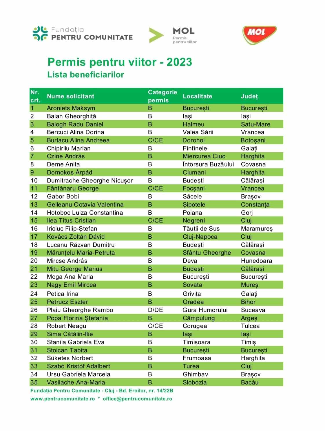 Beneficiarii acestei ediții a programului Permis pentru viitor provin din 21 județe: Argeș, Bacău, Bihor, Botoșani, Brașov, Călărași, Cluj, Constanța, Covasna, Galați, Gorj, Harghita, Hunedoara, Iași, Maramureș, Mureș, Satu Mare, Suceava, Timiș, Tulcea, Vrancea și din Municipiul București. Dintre cei 35 de beneficiari, 30 au obținut finanțare pentru a urma cursurile școlii de șoferi în vederea obținerii permisului de conducere la categoriile B, patru pentru categoria C/CE și un tânăr pentru categoria D/DE.