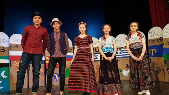 În imagine, echipajul Școlii Gimnaziale Nr. 1 Albeni, la Concursul Național Diversitatea, de la Deva, 2019 (elevii se numesc: Scăfaru Titu Sebastian, Coancă Mihai, Vasile Popescu Sorana-Theodora, Crețu Cerasela și Ochian Laura Bianca). În fundal, se pot observa câteva dintre cele 19 panouri realizate manual de către aceștia, fiecare panou simbolizând câte o minoritate din România.