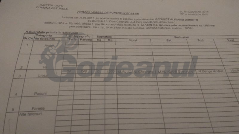 Spârlac M.Constantin în vârstă de 80 de ani, din Lupoaia, se roagă de trei ani de autoritățile locale din Cătunele să-i elibereze un titlu de proprietate pentru un teren în suprafață de 15 ari, pe care se află edificată o casă. Primăria a eliberat, în mod eronat, titlu de proprietate pentru terenul vârstnicului unui vecin de-al acestuia care ar fi obținut 200.000 de lei de la minerit pentru că terenul respectiv ar fi fost afectat de lucrările miniere din zonă. Spârlac a câștigat în 2016 definitiv și irevocabil anularea titlului respectiv și obținerea astfel a unui alt titlu pe numele său. În 2016, Primăria Cătunele îi eliberează adevăratului proprietar procesul verbal nr. 1208 pentru punerea sa în posesie pentru proprietatea respectivă. Demersul autorităților locale se oprește însă, cu trei ani în urmă, acestea nemaieliberând și noul titlu de proprietate deținătorului de drept al terenului.