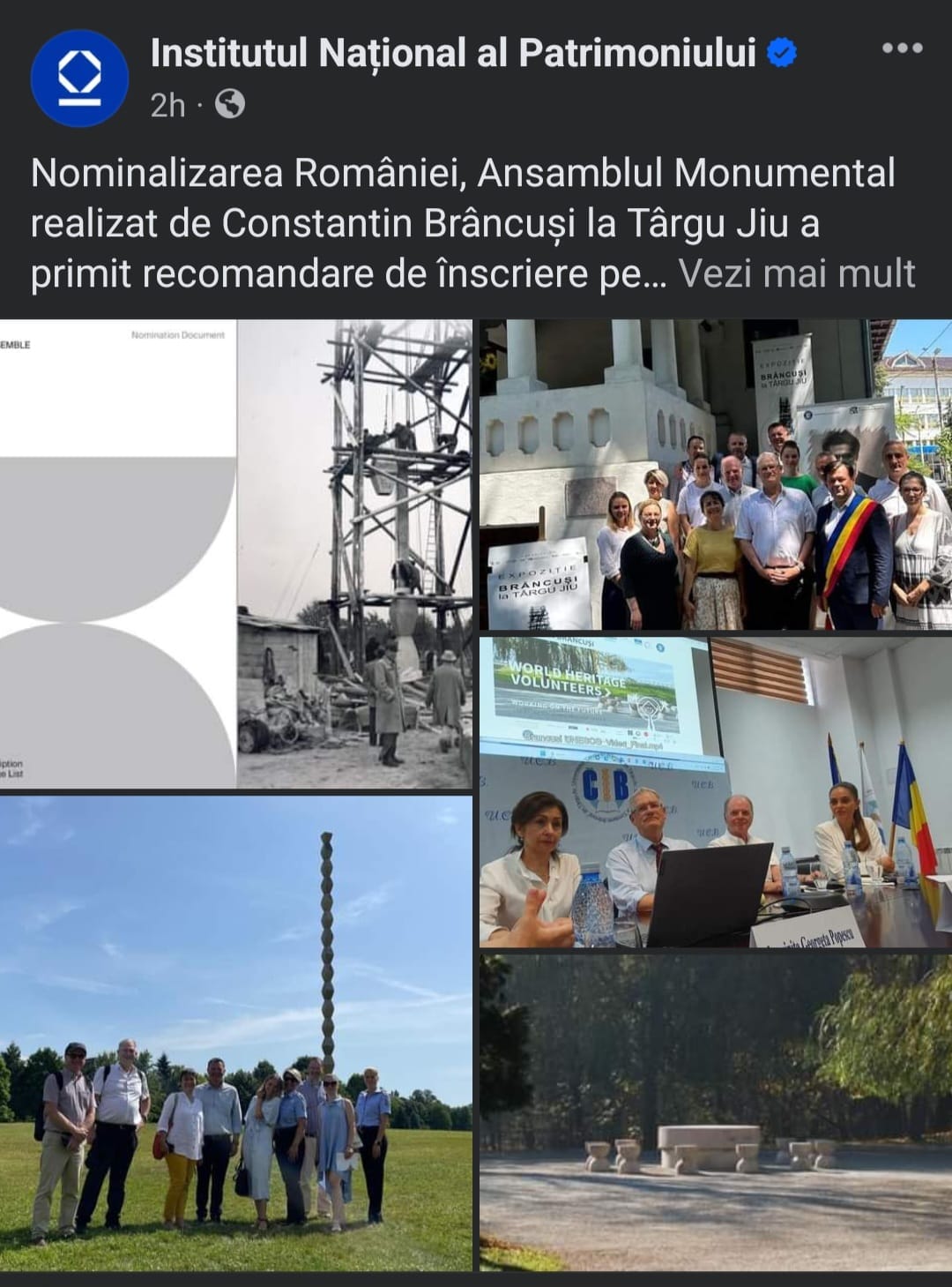 „Ansamblul Monumental realizat de Constantin Brâncuși la Târgu Jiu a primit recomandare de înscriere pe Lista Patrimoniului Mondial UNESCO din partea ICOMOS (Consiliul Internațional al Monumentelor și Siturilor)!