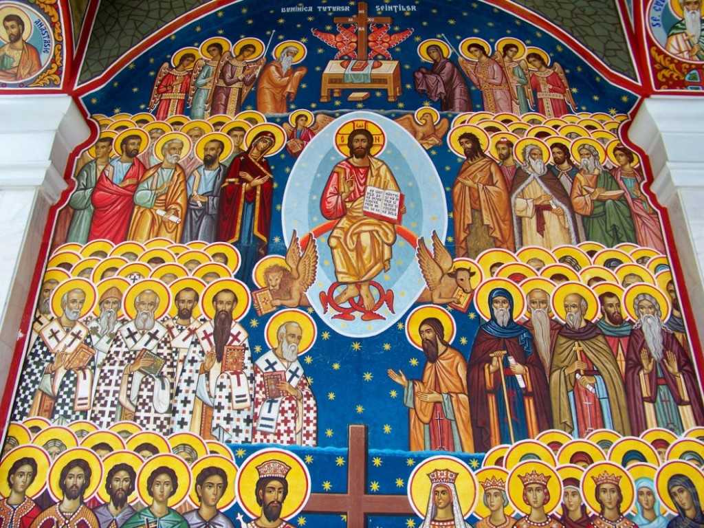 De aceea, Biserica înseamnă adunare, obște, pentru că nimeni nu se mântuiește singur, ci se mântuiește doar cu ajutorul lui Dumnezeu și împreună cu ceilalți și cu ajutorul sfinţilor Săi, iar, dacă omul este o ființă eminamente socială, atunci Biserica este instituția eminamente socială, care-și are rădăcinile în Cer, adică în Duhul Sfânt, care se face văzut prin lucrarea sfinţilor Lui Dumnezeu! Transformând fundamental o lume întreagă cu nemaipomenita propovăduire a lui Hristos Cel Înviat, a lui Dumnezeu care S-a descoperit oamenilor în trup şi apoi iarăşi S-a înălţat în cereasca-I împărăţie, sfinţii au semănat sămânţa unei credinţe noi, a unei vieţi noi, a unei zidiri noi! Astfel, au ieşit din lumea aceasta şi abia după înălţarea lor la cer s-a aprins lumea de focul seminţei semănate de ei, de focul cuvintelor rostite de ei, de focul urmelor lăsate de ei. Popoarele care i-au prigonit s-au risipit de pe faţa pământului, împărăţiile care le-au stat împotrivă s-au prăbuşit în ţărână; casele care nu i-au primit au căzut în ruină, puternicii lumii care i-au pus la chinuri s-au acoperit de ruşine şi au pierit jalnic. Iar sămânţa aruncată de ei a răsărit şi a dat în floare, pentru că din sângele lor a crescut Biserica, ridicându-se pe dărâmăturile mincinoaselor lucruri ieşite din mâini omeneşti, iar, cei ce i-au primit s-au înălţat, cei ce i-au crezut şi i-au urmat, apoi s-au mântuit! Să fim bine înţeleşi, Domnul nu înlătură dragostea pe care o datorăm părinţilor şi tuturor celor de aproape ai noştri, pentru că El Însuşi ne-a poruncit această dragoste! El Însuşi Și-a arătat dragostea pentru Sfânta Lui mamă, chiar pe Cruce fiind, când a încredinţat-o ucenicului iubit, spre a-i fi Ioan fiu în locul Său. Aici, însă, Hristos vorbeşte pentru vremurile de prigoană şi suferinţe care îi aşteaptă pe apostolii Săi. Tatăl şi mama se vor înfricoşa, fiul și fiica se vor înfricoşa! În concluzie, la numai o săptămână după Duminica Rusaliilor, deci după întemeierea Bisericii creștine, în calendarul nostru există Duminica Tuturor Sfinților, ce are două dimensiuni: una, în mod firesc, este de trebuință să ne aducem aminte de sfinții care formează elita Bisericii, iar, pe de altă parte, pentru că în calendarul nostru nu toate numele sfinților ne sunt cunoscute. Sunt foarte mulți martiri care au căzut în diferite părți ale lumii acesteia păcătoase, ale căror nume nu s-au păstrat. Pentru unii există documente, acte martirice păstrate până în ziua de astăzi, dar pentru foarte multe cazuri nu ni s-au păstrat niciun fel de urme, cu toate că știm că ei au existat, din anumite mărturii. Și știm că fiecare zi de peste an are pomenirea unuia, a doi sau mai multor sfinți, pe numele lor. Dar există nume de acestea care nu sunt în calendar, dar care nu trebuiesc neglijate, de aceea s-a hotărât ca această primă duminică de după Rusalii să se numească Duminica Tuturor Sfinților, a celor cunoscuți și a celor necunoscuți. Desigur, ca obște a fost întemeiată Biserica Lui Hristos și tot ca obște va intra în Împărăția lui Dumnezeu, care este prin sine o Obşte, aşa cum învierea cea din urmă o numim Învierea cea de Obște, iar pentru aceasta există sfinții lui Dumnezeu! Pentru că Dumnezeu-Cuvântul a fost Înălţat şi acum El şade de-a dreapta Slavei părinteşti, iar, după făgăduinţă, îi atrage la Sine pe toţi cei ce vor, aşa cum ne arată lucrarea mântuitoare a Dumnezeu-Cuvântului şi rostul cel mai din urmă al venirii Sale în trup, printre noi, astfel, ca pe toţi sfinţii să-i aducă la unirea şi la comuniunea cu Dumnezeu-Tatăl, ca pe o pârgă a firii omeneşti care în multe chipuri au bineplăcut Creatorului cerului şi al pământului!