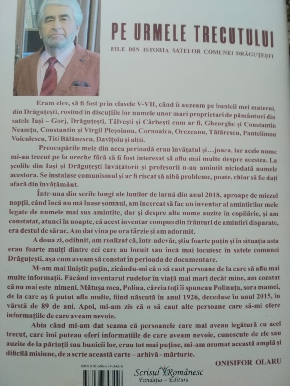 ,,Îi mulțumesc lui Dumnezeu că mi-a dat sănătatea, curajul, perseverența și starea sufletească, fără de care aceasta carte nu ar fi apărut niciodată” – (autorul – Profesor Onisifor Olaru).
