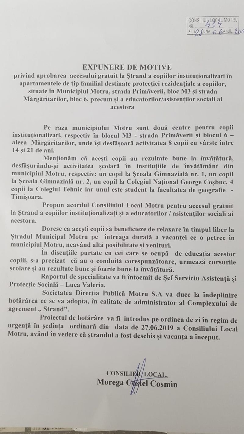 Copiii, care locuiesc în două apartamente ale DGASPC din Motru, cu vârste cuprinse între 14 și 21 de ani, cel mai mare fiind student la Facultatea de Geografie din Timișoara, iar restul fiind elevi la școlile de pe raza municipiului cu rezultate bune la învățătură și un comportament decent în societate, vor beneficia de intrare gratuită la ștrandul din oraș. Gratuitatea se aplică de săptămâna aceasta pe baza unui proiect de hotărâre inițiat de viceprimarul Cosmin Morega și aprobat săptămâna trecută de toți consilierii locali prezenți la ultima ședință ordinară.