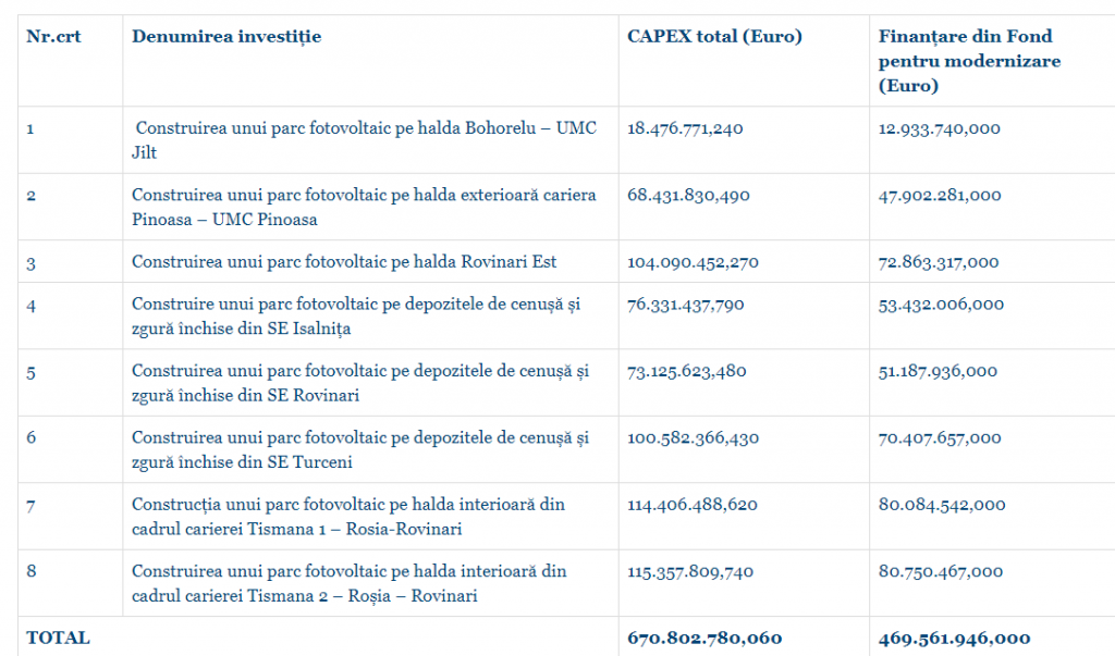 Complexul Energetic Oltenia solicită 470 de milioane de euro pentru construirea a opt parcuri fotovoltaice pe terenuri pe care le deține, halde de steril sau depozite de cenușă și zgură închise. În total, valoare investițiilor propuse depășește 670 de milioane de euro, fără TVA.