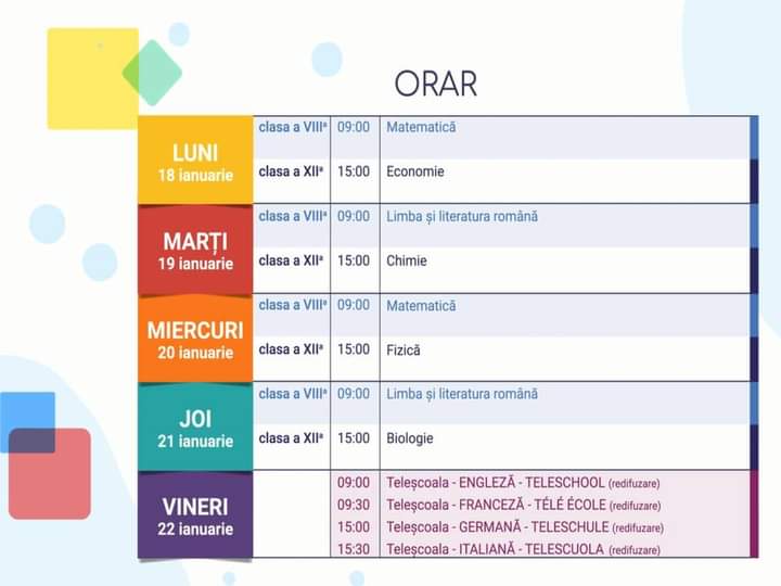 Lecțiile pot fi urmărite în direct, de la orele 9.00 și 15.00, de luni până vineri, pe TVR 2, dar și ulterior, înregistrate, în funcție de programul fiecăruia, pe TVR+, YouTube #TVR, Teleșcoala TVR și tvr.ro.