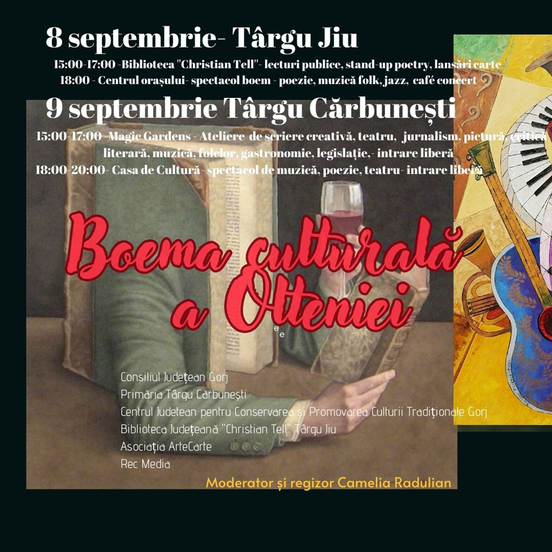,,Dragi cărbuneșteni, vă aștept cu drag la prima ediție a Galei Boema Culturală a Olteniei, eveniment pe care l-am concretizat cu sprijinul Primăriei Târgu Cărbunești, în special al domnului primar Dănuț Birău, al Consiliului Județean Gorj, Bibliotecii Județene Christian Tell din Târgu-Jiu, Centrului Județean pentru Conservarea Culturii Târgu Jiu, Asociației ArteCarte afiliată Artec, societății de media Rec Media. Vă oferim, în data de 9 septembrie, în intervalul orar 15.00-17.00, la Magic Gardens, ateliere tematice de poezie, scriere creativă, teatru, muzică clasică instrumentală și vocală, gastronomie, pictură, mișcare scenică, jurnalism, critică literară, traduceri, consiliere juridică, sculptură, tradiții. De la ora 18.00, vă oferim, la Casa de Cultură a orașului Târgu Cărbunești, un spectacol de mare ținută, însumând lecturi poetice, teatru, muzică clasică, jazz, cafe concert, folk, folclor și întâlniri cu mari oameni de cultură ai României. Intrarea la acest eveniment este gratuită. Haideți să facem împreună din orașul nostru un pol a frumosului și al culturii!”, a transmis poeta Camela Radulian.