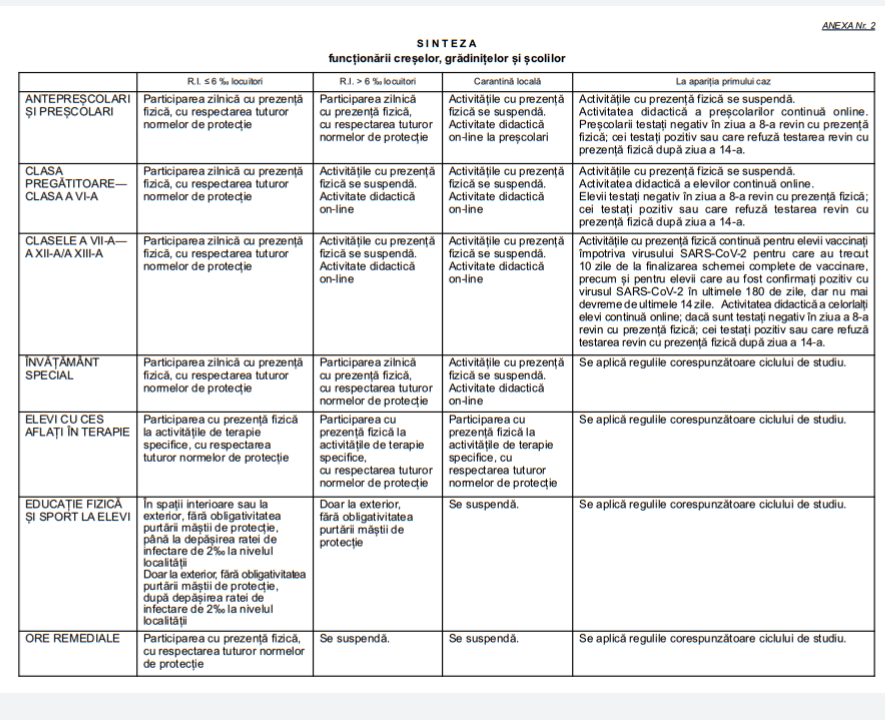 Ordinul pentru aprobarea măsurilor de organizare a activității în cadrul unităților/instituțiilor de învățământ în condiții de siguranță epidemiologică pentru prevenirea îmbolnăvirilor cu virusul SARS-CoV-2 a fost publicat astăzi în Monitorul Oficial. Scenariile rămân cele deja anunțate: cursuri cu prezență fizică pentru toți preșcolarii și elevii până la pragul de 6 la mie, cursuri online după depășirea pragului de 6 la mie; excepție fac antepreșcolarii, preșcolarii și elevii din învățământul special.