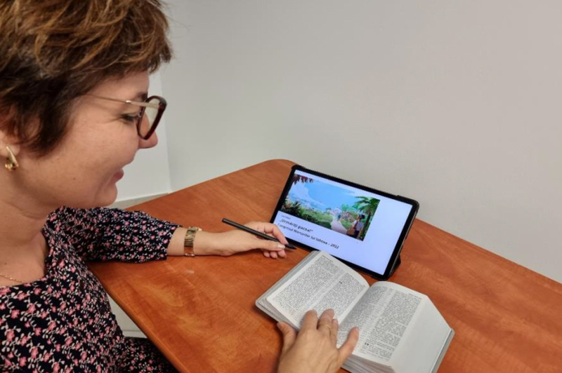 Manuela Vâlceanu, din Târgu-Jiu, analizează programul congresului în aplicaţia JW Library
