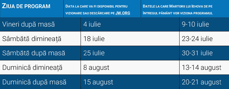 Martorii lui Iehova organizează congrese la nivel mondial de mai bine de 100 de ani. La fel ca în ultimii doi ani, şi anul acesta congresul va putea fi urmărit online, fiind postat pe site-ul jw.org în lunile iulie şi august. Congresul va putea fi vizionat şi accesând secţiunea JW Broadcasting din aplicaţia gratuită JW Library ori folosind platforme de streaming, precum ROKU TV sau Apple TV. Programul este gratuit. Nu este necesar să se facă un cont online pentru a fi urmărit.