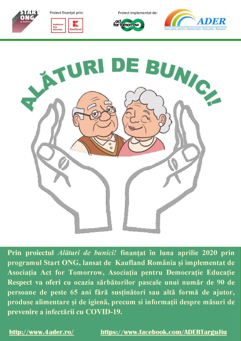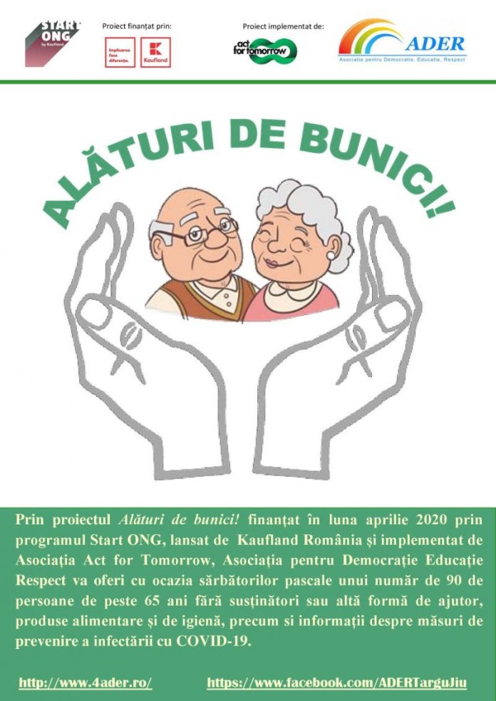 Asociația pentru Democrație, Educație și Respect implementează în perioada 14 aprilie – 14 mai 2020 proiectul ,,Alături de bunici”.Finanțat prin programul Start ONG, prin acest proiect vor fi oferite, cu ocazia Sărbătorilor Pascale, unui număr de 90 de persoane de peste 65 ani fără susținători sau altă formă de ajutor, produse alimentare și de igienă, precum și informații despre măsurile de prevenire împotriva infectării cu COVID-19.Start ONG este un program lansat de Kaufand România și implementat de Asociația Act for Tomorrow. Distribuția acestor achete a început încă de ieri, iar astăzi va fi finalizat pentru vârstnicii fără susținători din localitățile Drăguțești și Târgu-Cărbunești.