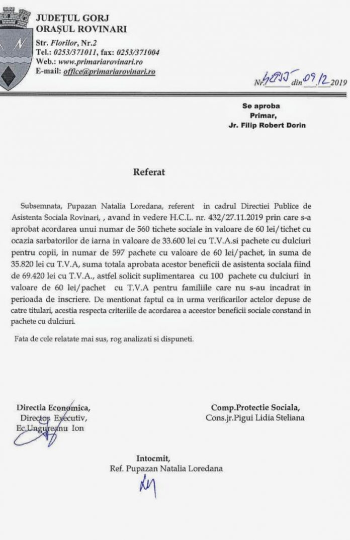 Consilierii locali rovinăreni au aprobat suplimentarea cu 100 pachete cu dulciuri în valoare de 60 lei/pachet pentru familiile care nu s-au încadrat în perioada de înscriere. În total, Primăria Rovinari oferă, în pragul Crăciunului, pachete cu dulciuri pentru 697 de copii, precum şi 560 de tichete sociale în valoare de 60 de lei fiecare.
