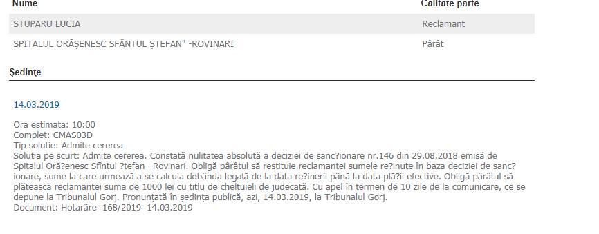 Asistenta medicală s-a îndreptat în instanţă, susţinând că a fost sancţionată ilegal, pentru că în cazul său nu a fost demarată o anchetă disciplinară, aşa cum prevede legea. „Cu excepţia sancţiunii avertismentului scris, nici o altă sancţiune disciplinară nu poate fi aplicată fără efectuarea cercetării disciplinare prealabile. Având în vedere faptul că analiza cerinţelor de legalitate prevalează celor referitoare la temeinicia deciziei, apare inutilă cercetarea celorlalte motive invocate de reclamant în dovedirea netemeiniciei deciziei de sancţionare”, a decis o instanţă a Tribunalului Gorj, care a constatat nulitatea absolută a deciziei de sancţionare, cu consecinţa restituirii sumelor reţinute în baza acestei decizii, la care urmează a se calcula dobânda legală. „Obligă pârâtul să plătească reclamantei suma de 1.000 lei cu titlu de cheltuieli de judecată. Cu apel”, se arată în sentinţa din 14 martie 2019 a Tribunalului Gorj.