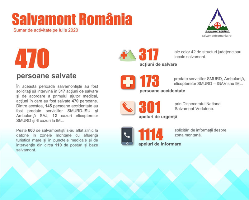 Luna iulie, fiind o lună de vârf a sezonului de vară, caracterizată printr-un număr foarte mare de turiști pe munte, a impus asigurarea asistenței de salvare montană la un nivel maxim, zilnic, un număr de 500 – 600 de salvamontiști aflându-se la datorie în zonele montane cu afluență turistică mare, în punctele medicale și de intervenție din cca 110 posturi și baze salvamont. În această perioadă salvamontiștii au fost solicitați să intervină în 317 acțiuni de salvare și de acordare a primului ajutor medical, acțiuni în care au fost salvate 470 de persoane. Dintre acestea, 145 de persoane accidentate au fost predate, pentru transport de urgență la unitățile medicale de specialitate, serviciilor SMURD sau de Ambulanță, 12 persoane elicopterului SMURD, iar șase persoane serviciului I.M.L.Prin Dispeceratul Național Salvamont-Vodafone au fost primite, direct, 301 apeluri prin care anunțau accidente montane, restul apelurilor de urgență fiind primite și preluate de către salvamontiști prin Serviciul Unic de Urgență 112 sau prin dispeceratele locale ale echipelor salvamont. De asemenea, în cursul lunii iulie s-au primit 1.860 de apeluri prin care solicitau informații despre zona montană, dintre acestea, 1.114 apeluri fiind înregistrate la Dispeceratul Național Salvamont-Vodafone, restul de 745 apeluri fiind făcute direct structurilor salvamont locale sau județene.,,Structurile Salvamont au avut un grad de răspuns de 100% la solicitările specifice domeniului de activitate, doar cu resursele proprii, acest lucru confirmând că acestea sunt organizate corespunzător, își dimensionează corect, își dezvoltă permanent resursele umane și materiale și, în activitatea derulată, nu au solicitat și au demonstrat că nu au nevoie de alte resurse, exceptând cele de preluare pentru transport al accidentaților către unitățile medicale, ambulanțe SAJ, SMURD, respectiv elicoptere IGAV-SMURD, resurse care au fost asigurate corespunzător în baza relației de coordonare operativă existentă cu Departamentul pentru Situații de Urgență din cadrul Ministerului de Interne”, a precizat președintele Asociației Naționale a Salvatorilor Montani din România, Sabin Cornoiu.În cadrul celor 42 de structuri Salvamont din România, singurele structuri abilitate oficial și care dețin personal pregătit profesional și atestat pentru a interveni pentru salvarea persoanelor accidentate în zona montană, activează un număr de circa 800 de salvatori montani atestați, dintre care aproape 400 sunt salvatori montani angajați. Cunoscând specificul și numărul mare de intervenții din luna august, luna în care se înregistrează cel mai mare număr de evenimente din sezonul de vară, serviciile salvamont vor continua să asigure efective maxime de salvatori montani, astfel încât să se reușească intervenția cu operativitate în situația producerii de accidente.