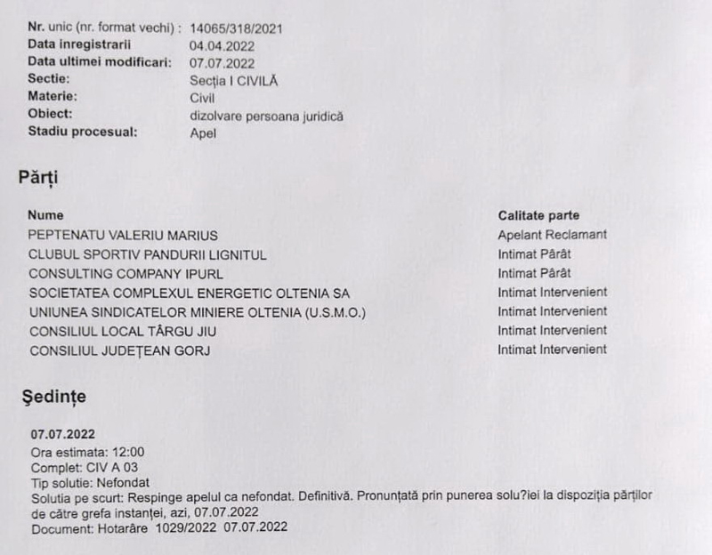 Pandurii Târgu Jiu a remis, luni, un comunicat oficial prin care arată că Tribunalul Gorj a respins definitiv cererea de dizolvare a clubului, solicitare care a fost depusă în instanță, în anul 2021, de către fostul lider de galerie Valeriu Peptenatu. ,,Acțiunea lui Valeriu Peptenatu împotriva clubului Pandurii Târgu Jiu a fost deja respinsă de către prima instanță, în data de 16 februarie 2022. La soluția astfel dispusă de Judecătoria Târgu Jiu, solicitantul dizolvării clubului sportiv a înaintat apel, fiind susținut în acest demers de Primăria Târgu Jiu, Consiliul Judetean Gorj și Complexul Energetic Oltenia, ca intervenienți. La ședința din 7 iulie 2022 a Tribunalului Gorj, reprezentanții Primăriei Municipiului Târgu Jiu și Consiliului Județean Gorj au delegat juriști din cele două instituții care să-l susțină pe reclamantul V. Peptenatu și au cerut instanței să îi admită acestuia apelul, însă cererea a fost respinsă ca nefondată, decizia instanței de apel fiind definitivă”, precizează panduriics.ro.