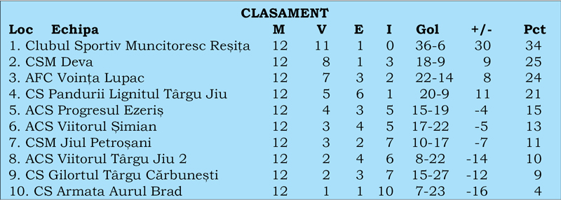 Pandurii Târgu Jiu merge din rău în mai rău. Trupa gorjeană a înregistrat prima înfrângere în actualul sezon al ligii a treia şi a căzut pe locul 4 în Seria 7. Plecată cu gândul de a promova, formația condusă acum de Mario Găman nu a mai cunoscut gustul victoriei de 6 partide. De la instalarea antrenorului gorjean la timonă, alb-albaştrii au luat doar 2 puncte în 3 meciuri. Ultima partidă a fost şi cea mai dificilă, având în vedere că Voinţa Lupac era la egalitate de puncte cu Pandurii înainte de această rundă. Daniel Vădrariu a deschis scorul pentru gazde după numai 4 minute, după ce amfitrionii au recuperat repede o minge degajată de Iovicin şi au dus balonul fără prea mari dificultăți în careul advers. Gorjenii au egalat după o fază fixă. Andrei Georgescu a fost primul la minge după un şut respins de Căpăţână şi a împins balonul în plasă (55). Din păcate, restul reprizei a fost un coşmar pentru vizitatori. Pandurii au rămas în inferioritate numerică, după eliminarea lui Gomes (68), o decizie controversată a brigăzii de arbitrii. Chiar şi în inferioritate numerică, gorjenii nu au făcut pasul în spate, dar au fost prinşi pe o contră finalizată de Cristian Popa (82).